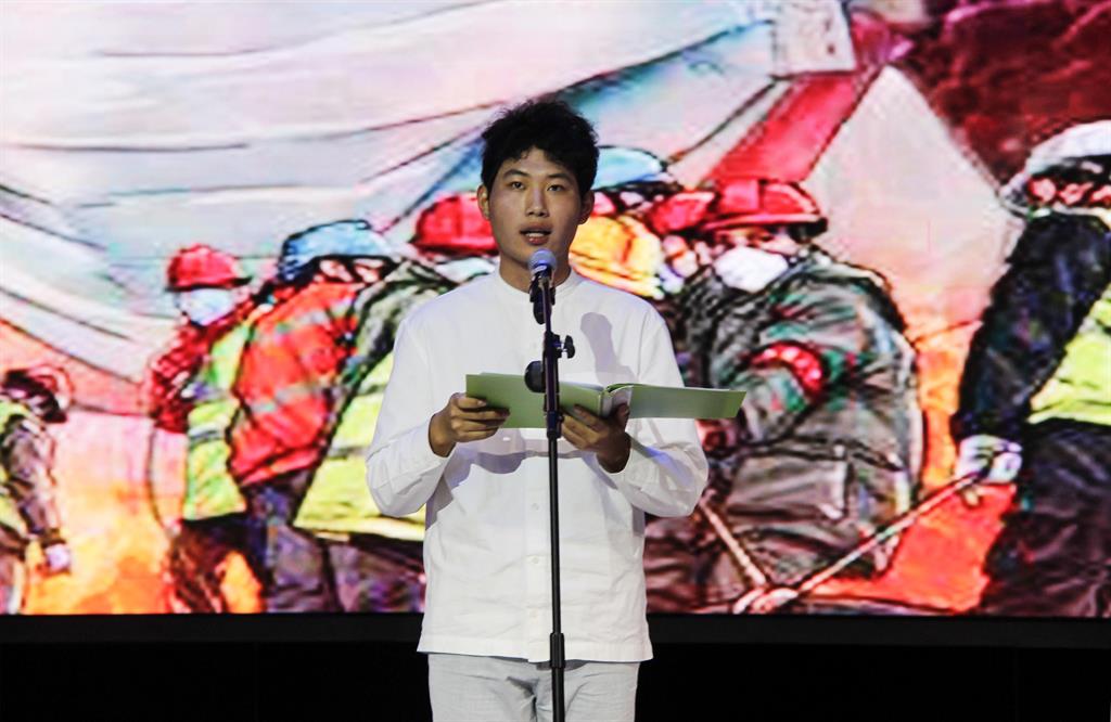 二等奖获得者石长林诵读《铭记同胞,致敬英雄》。2020年是不平凡的一年,我们有现在这样的生活,离不开那些英雄们的努力,从抗击新冠疫情到抗洪抢险一线,正是一个个英雄,为我们守护当下,岁月静好,只不过是有人替我们负重前行。