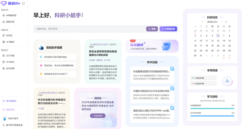 “智研AI+”——万方数据智慧研究平台(智研平台),面向学者在科研学习、创作投稿、项目申报、素养提升等不同场景的实际需求,提供智能发现、智慧研读、创作投稿、知识管理、项目申报支持等全流程科研支持,为科研创新的关键环节深度赋能。